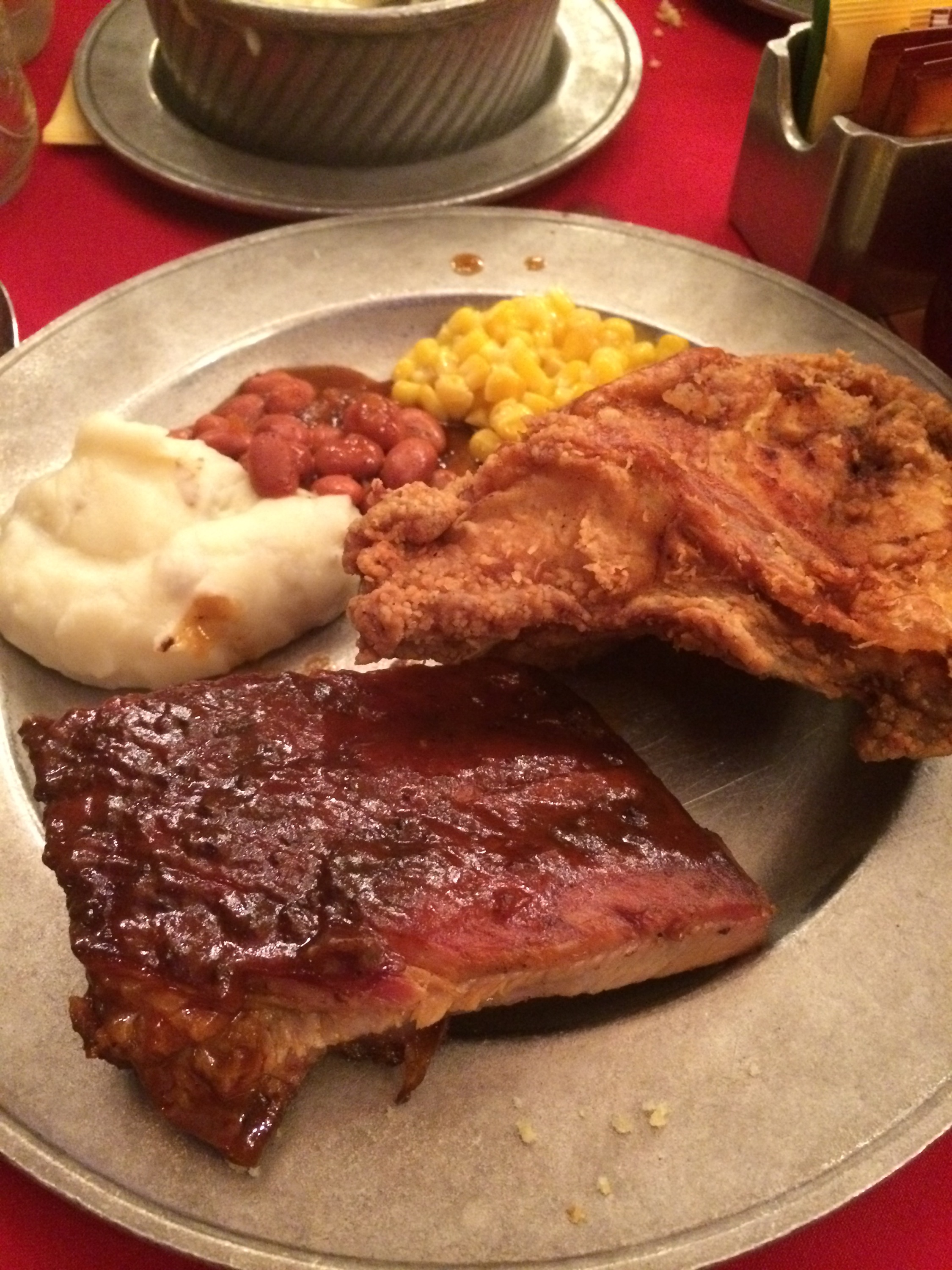 As the on-stage singing continues, people start coming out and dropping buckets of chicken and ribs on the table. Then there’s corn, beans, and mashed potatoes. As you eat, it keeps coming. There is no end to the food.